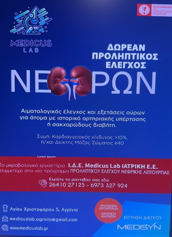 Το Medicus Lab συμμετέχει στο Εθνικό πρόγραμμα Προσυμπτωματικού ελέγχου ΠΡΟΛΗΠΤΙΚΟΣ ΕΛΕΓΧΟΣ ΝΕΦΡΟΥ του Υπουργείου Υγείας.